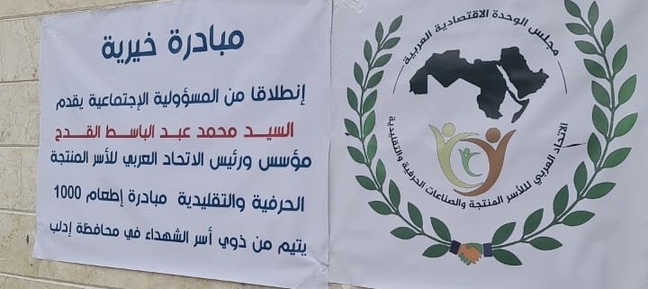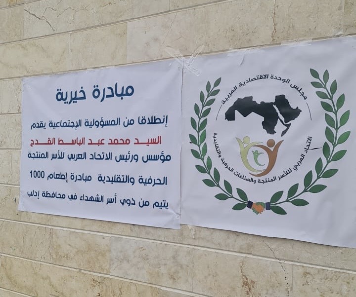 برعاية السيد محمد عبد الباسط قدح رئيس الاتحاد العربي للأسر المُنتجة والصّناعات الحرفية والتّقليدية تم تنظّيم مُبادرة خيرية في محافظة #إدلب لـ 1000 يتيم من أبناء الشهداء الكِرام حيثُ بدأت بتقديم وجبة غداء وسط فعاليات ترفيهية تعنى بإدخال الفرح والسرور لقلوبهم ثم تم تقديم مِنح مالية في سبيل إظهار القليل من الفضل العظيم الذي قدّمهُ ذويهم من دِماء غالية لنعيش اليوم على هذه الأرض بكرامة.