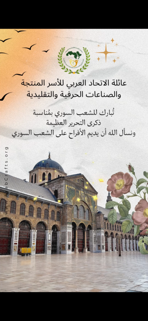 بمناسبة عيد التحرير، يتقدّم الاتحاد العربي للأسر المنتجة والصناعات الحرفية والتقليدية بأسمى التهاني وأطيب التمنيات إلى الشعب السوري الكريم، راجين أن تحمل هذه المناسبة الوطنية معاني العزة والطمأنينة، وأن تكون أيام سورية القادمة عامرة بالسلام والنهوض والازدهار.